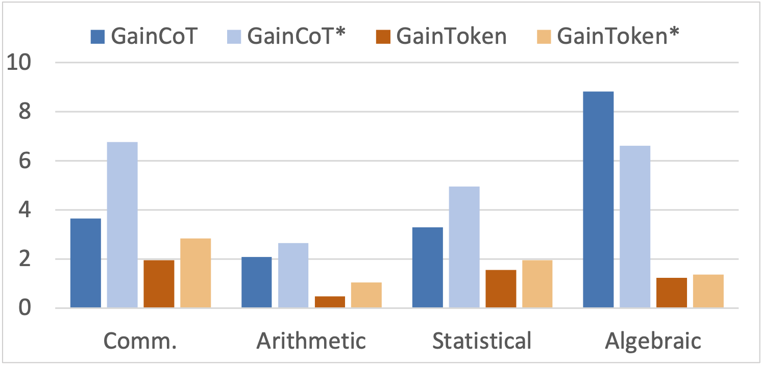 Figure 3: The effectiveness of a thinking pattern depends on its refinement and the exclusion of redundant or invalid reasoning. We compare the \( \mathbf{Gain_{token}} \) for both datasets on MathVista tasks.