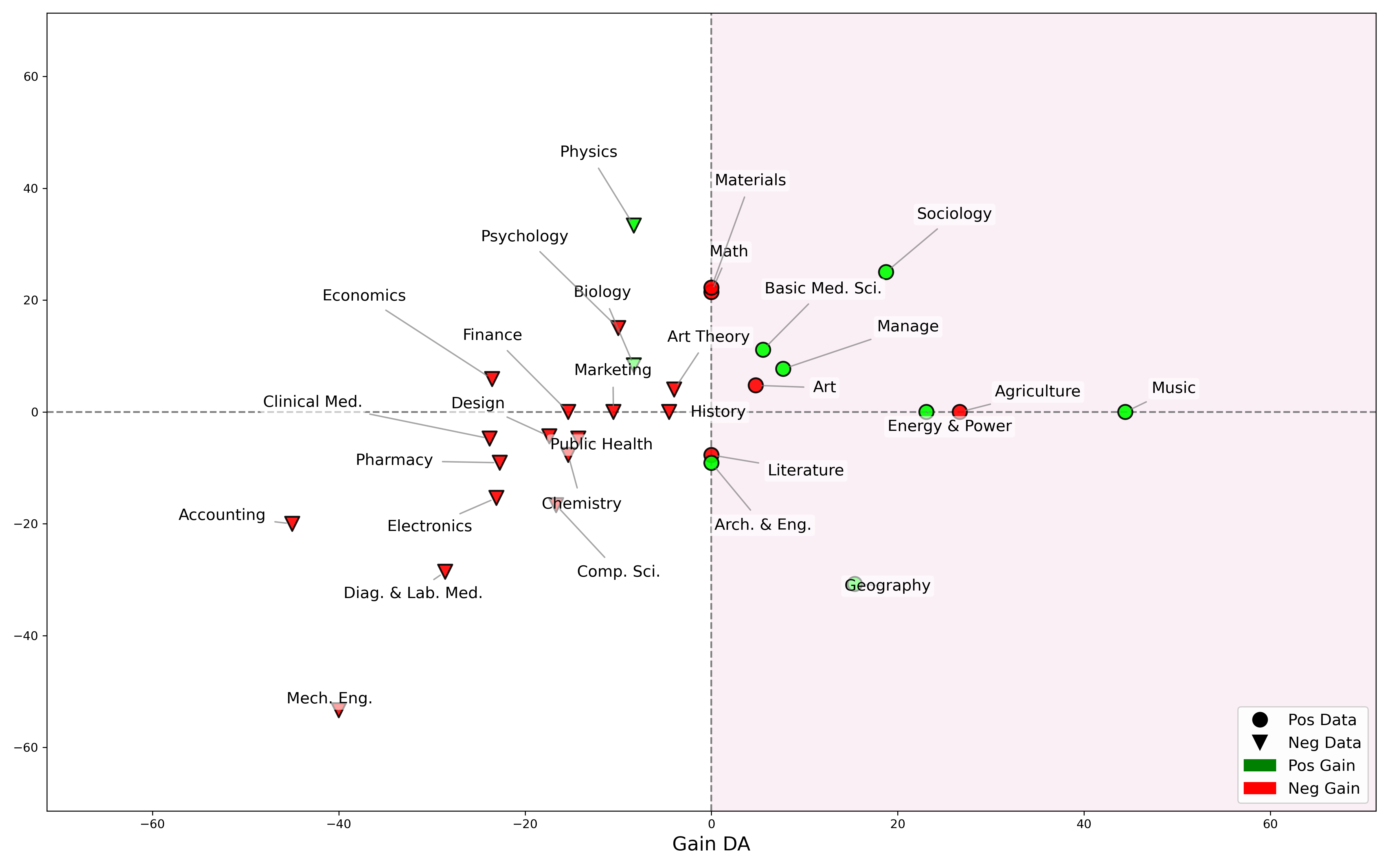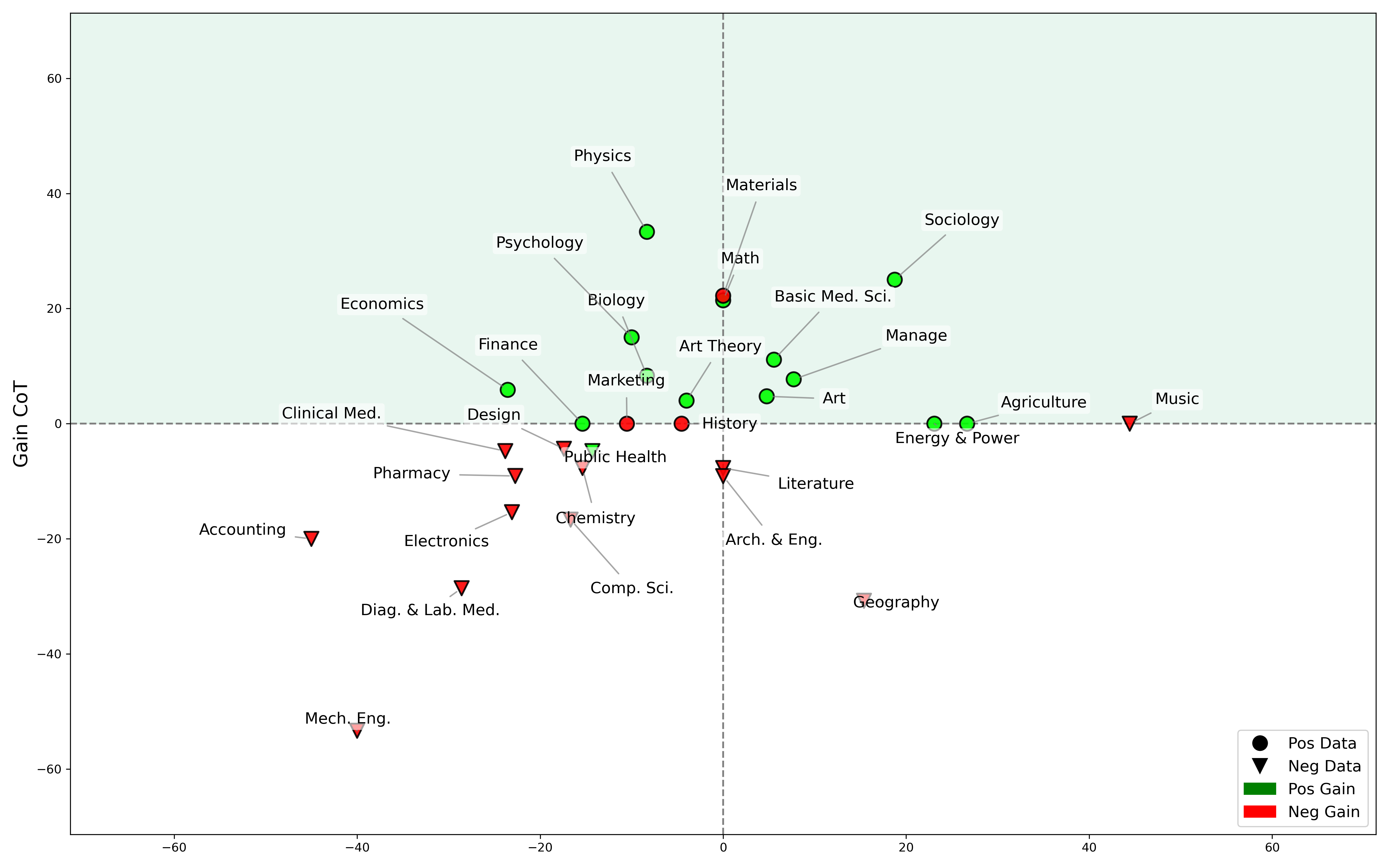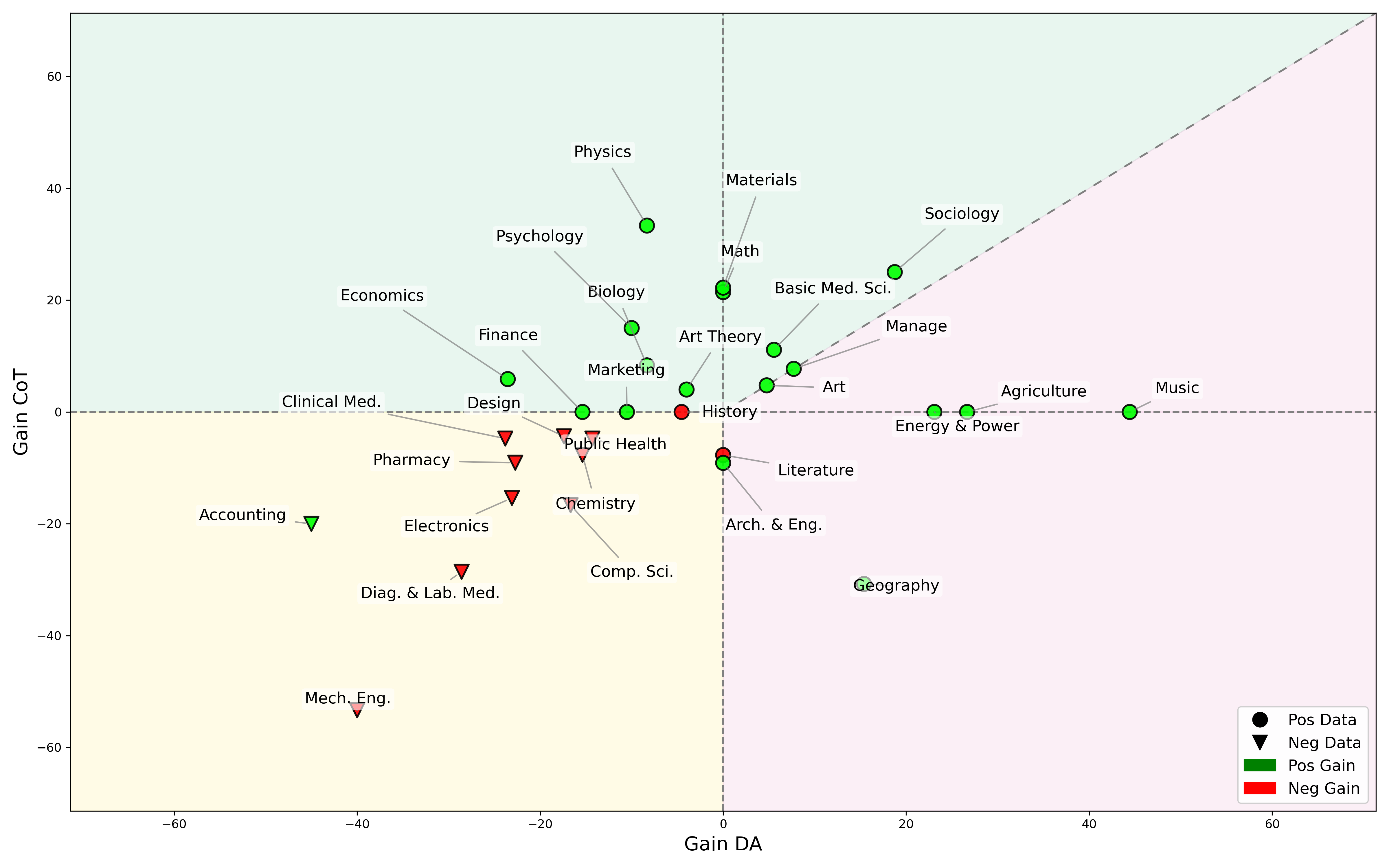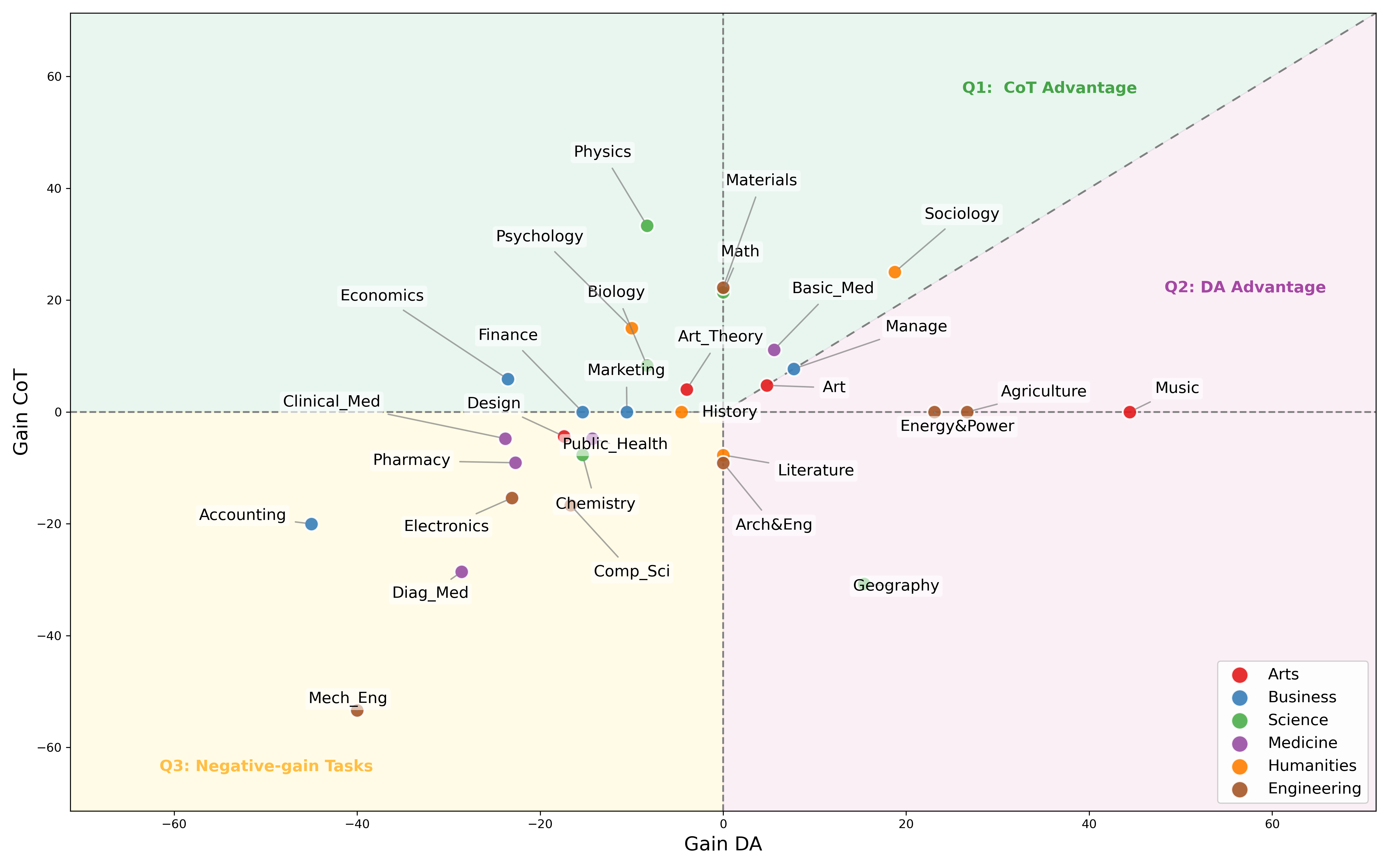 Figure 4: We plot each task's \( \mathbf{Gain_{CoT}} \) and \( \mathbf{Gain_{DA}} \) in a two-dimensional coordinate map. Through three distinct regions, we categorize the suitability of different tasks for the two training modes.