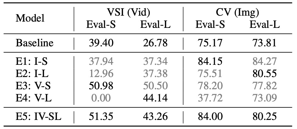 Table 1: Results of preliminary experiments on spatial reasoning. Baseline: Qwen2.5-VL-7B. I: Image Spatial Data. V: Video Spatial Data. S: Direct-Answer. L: CoT.