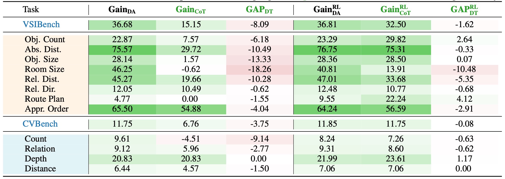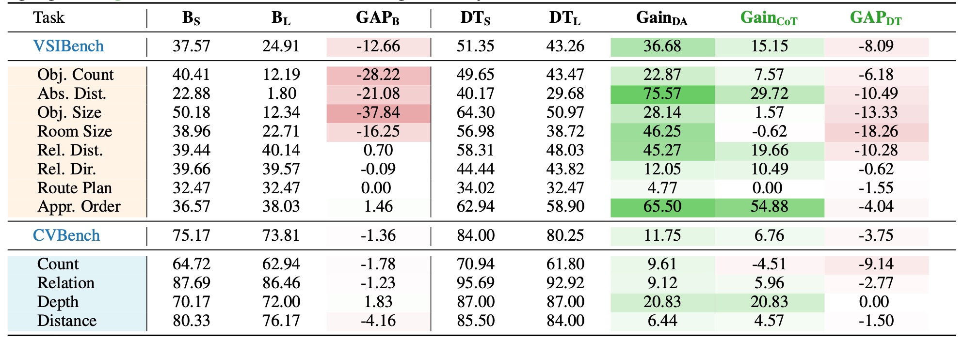 Table 3: Experimental results on spatial tasks. Values in red and green denote negative and positive results, respectively. A task is identified as suitable for reasoning-oriented training only when both \( \mathbf{Gain_{CoT}} \) and \( \mathbf{GAP_{DT}} \) exhibit concurrent positive values (highlighted in green), which constitutes the Thinking Boundary.