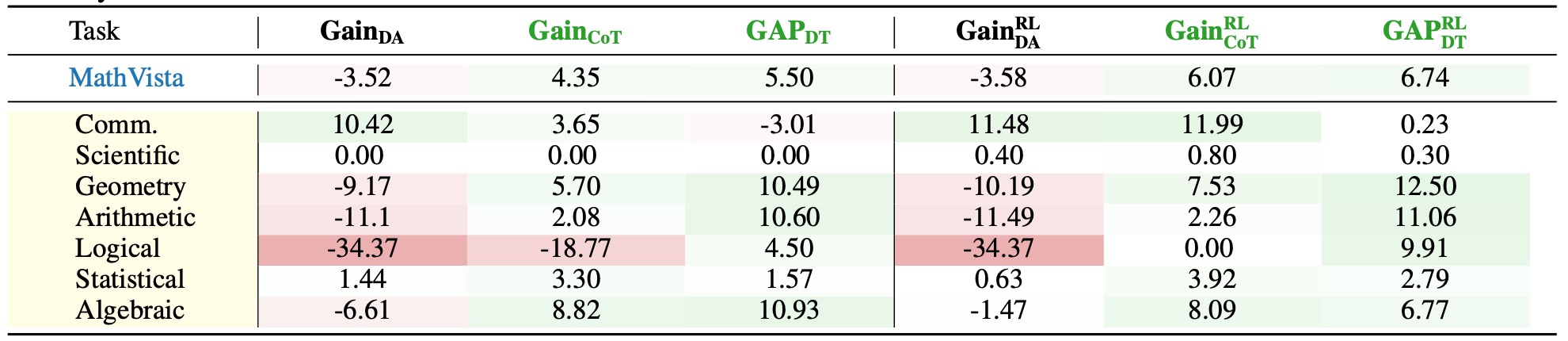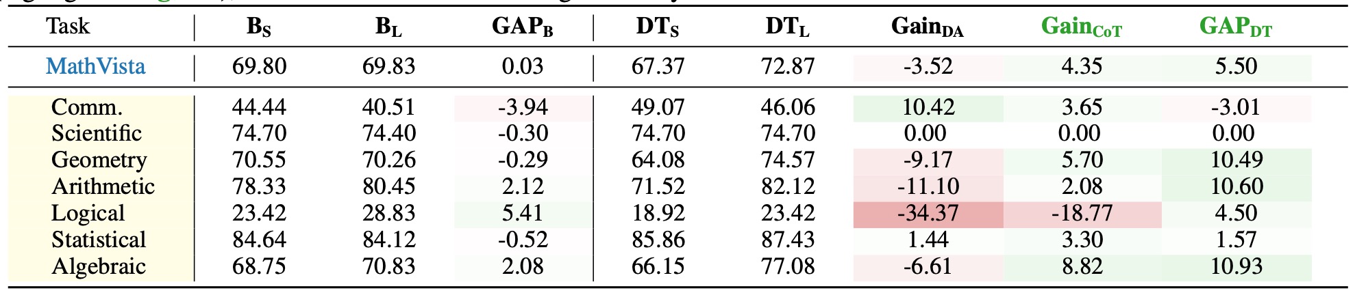 Table 4: Experimental results on MathVista tasks. Values in red and green denote negative and positive results, respectively. A task is identified as suitable for reasoning-oriented training only when both \( \mathbf{Gain_{CoT}} \) and \( \mathbf{GAP_{DT}} \) exhibit concurrent positive values (highlighted in green), which constitutes the Thinking Boundary.