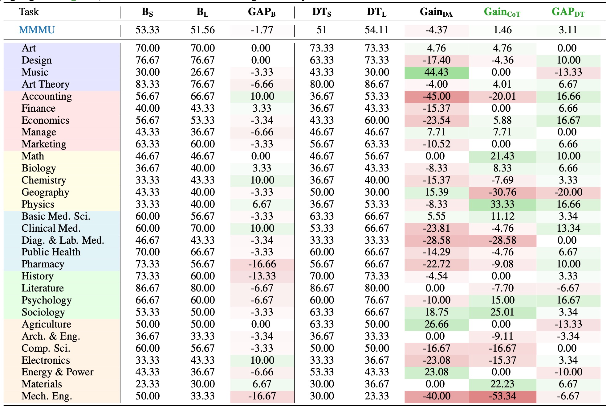 Table 5: Experimental results on MMMU tasks. Values in red and green denote negative and positive results, respectively. A task is identified as suitable for reasoning-oriented training only when both \( \mathbf{Gain_{CoT}} \) and \( \mathbf{GAP_{DT}} \) exhibit concurrent positive values (highlighted in green), which constitutes the Thinking Boundary.